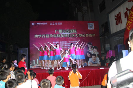 当天晚上七点,“助学公益行暨孕育快车进社区”大型公益晚会在社区阿姨们活力十足的广场舞中喜庆开场。舞蹈、杂技、魔术、唱歌、小丑等精彩纷呈的高质量节目吸引了500多名当地百姓观看。