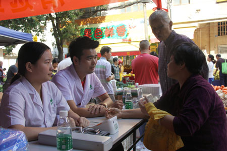 17日当天恰逢清远市清城区洲心街道赶圩的日子,从十里八乡来赶圩的人们挤满了各条道路。下午17:00左右,圩市早已结束,许多赶圩的人们却还没有散去。一些夫妻兴致勃勃地观看广州圣丹福医院精心准备的不孕成功案例报喜墙、孕育和孕育技术宣传牌,不少年轻媳妇在认真向孕育咨询生宝宝的事,也有老人体验了量血压、测血糖的体检服务。