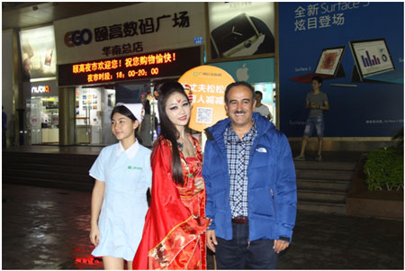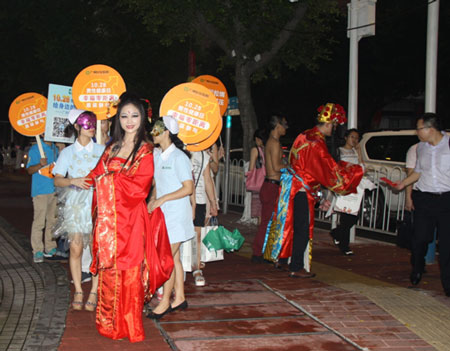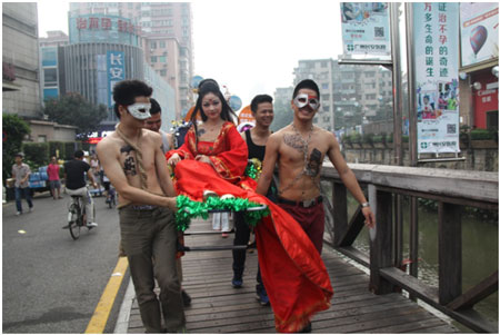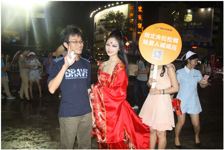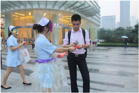下午5时许,数十名化妆后的广州圣丹福医院工作人员“突然”现身天河正佳广场,只见他们分别扮演“财神”、“妖女”、猛男和护士等角色,并手持“男人好,才是真的好”、“男人很累,需要安慰”、“给丈夫松松绑,给男人减减压”等关注男性健康的广告牌沿街宣传,此举引来大批现场市民围观。