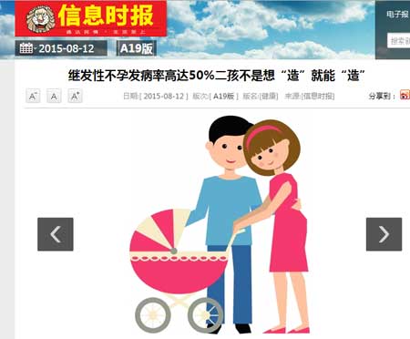 “继发性不孕的发病率近年在明显攀升。” 广州圣丹福医院不孕不育喻早告诉记者,从医院接诊的数据看来,35~45岁是准备生二胎的主要人群,但这部分人群也存在突出的问题。首先是年龄偏大,身体各方面条件偏差,不容易怀孕;其次是这部分女性妇科炎症多见,且一般有多年上环的经历,长期上环后再取环,子宫会有一个修复的过程,这样会使得二次备孕更困难一些。“从临床经验来看,胎顺产的女性在5年内怀第二胎的通常不会有太大的困难,但是超过5年再生第二胎的,发生继发性不孕的几率就会明显增加。” 喻早称。